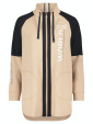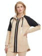 Beżowo-czarna długa bluza na zamek, kieszenie, przy dekolcie troczki z czarnymi gumowymi napisami. Z przodu biały napis i cekiny. Do kompletu spodnie SKU 6685 1893 beżowe lub czarne.