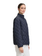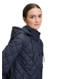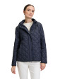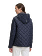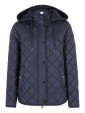 Pikowana kurtka zapinana na zamek i zatrzaski, odpinany kaptur na zamek.